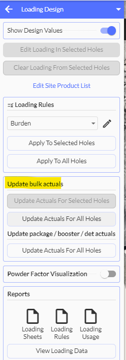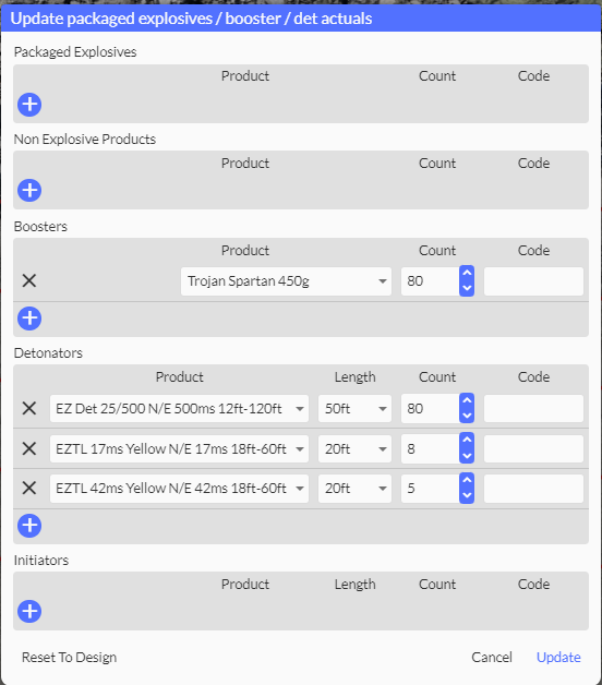 Any loading product information can be updated after the blast through the loading module under "Update actuals" for both bulk explosive products and caps/boosters/detonators. Date codes can also be entered here as well to appear on the blast report.