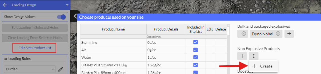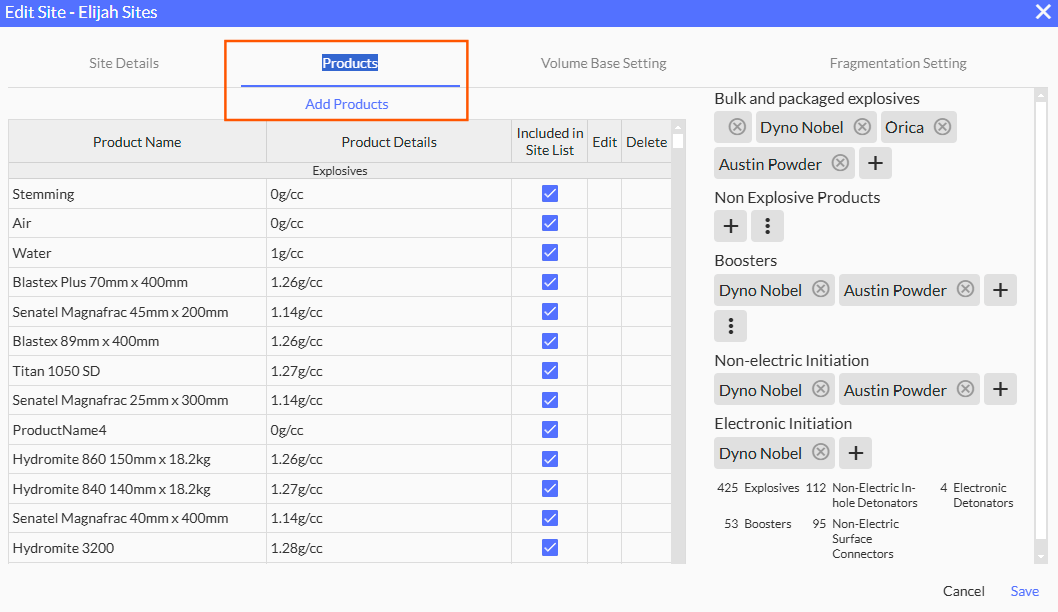Non - Explosive products can be added through the Site Product List when loading a blast or under the site details. These products will save for the site, so they can then be selected in the "Update Product Actuals" (seen above) to be included on the report.