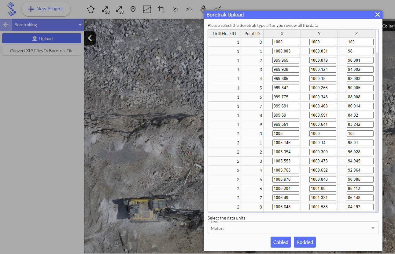 After boretrak files are successfully uploaded, a table will be shown to verify your boretrak data. You will then have to specify the "Metric Type" to specify the metric type of uploaded file which by default is meter. The metric unit that you specify is just for the uploaded file and it is independent of the user account units. Then, choose the type of boretrak by clicking on Cabled or Rodded.