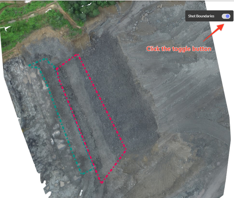 Click to toggle on the shot boundaries created in the pre-blast project. This visualization allows the user to easily line up the individual muckpile sections with the associated blast areas.