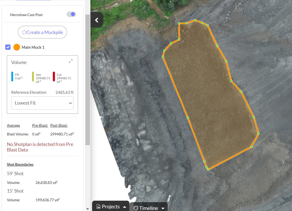 All muckpile boundaries for the project can be shown over the orthomosaic with each muckpiles individual volume information shown on the left-hand side.