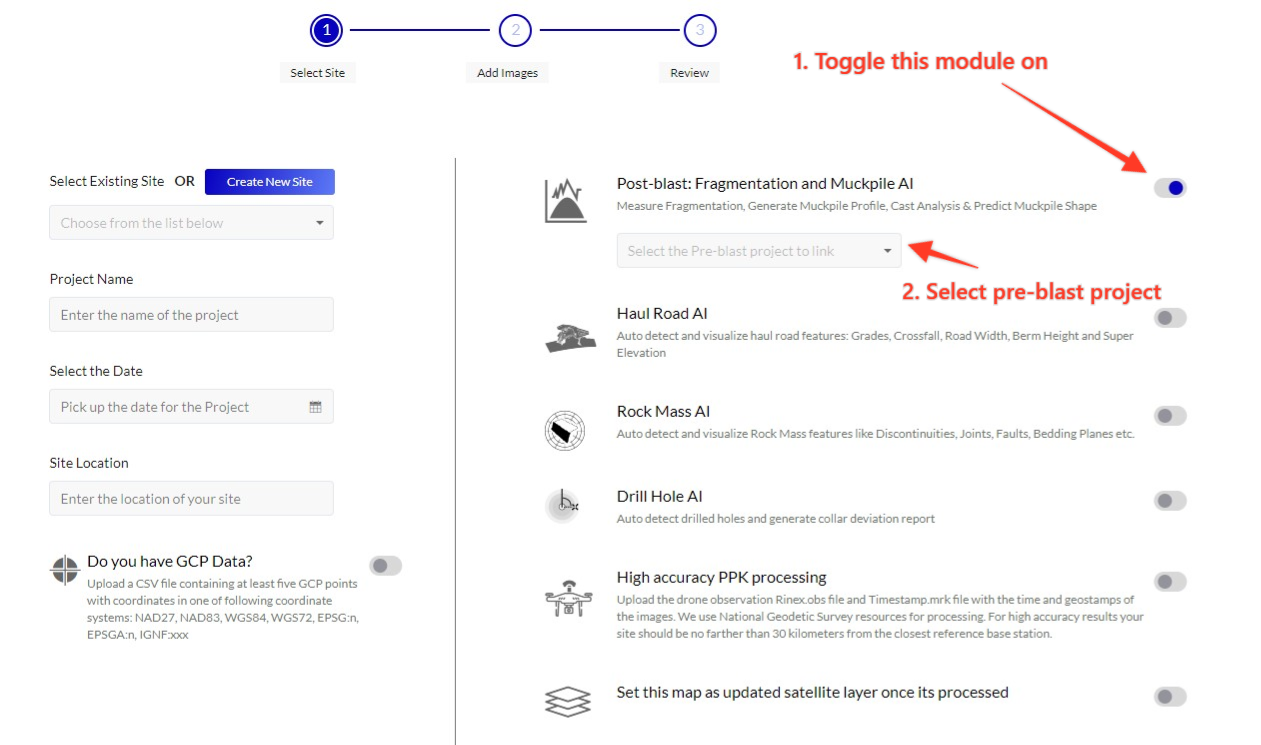 Be sure to link the pre-blast and the post blast by toggling on the "Post Blast" module and selecting the pre-blast project.