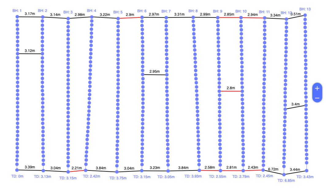 3) Minimum separation distance between holes. Distances shown between adjacent collars and toes as well as between the two closest points on adjacent holes. Connections are highlighted in red if they are below the "Minimum Hole Separation" entered in the sidebar to the left of the report screen.