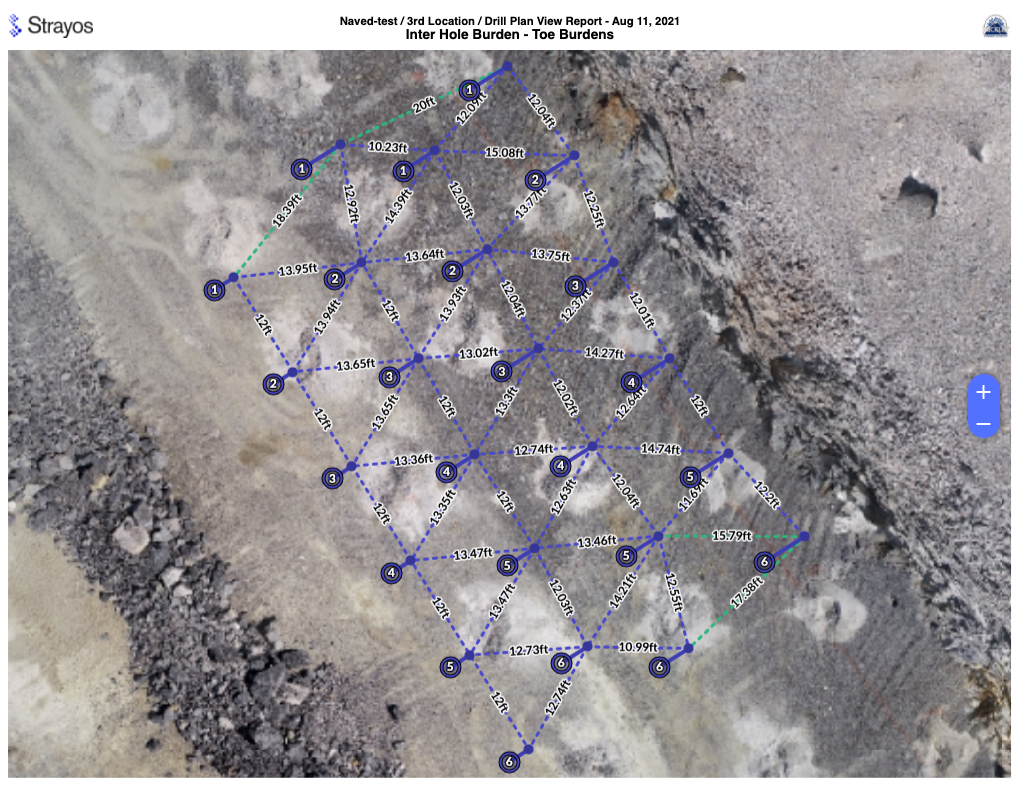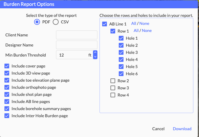 Burden Reports allow you to download a PDF or CSV showing the 2D and 3D minimum burdens for each hole along with a set of cover pages.