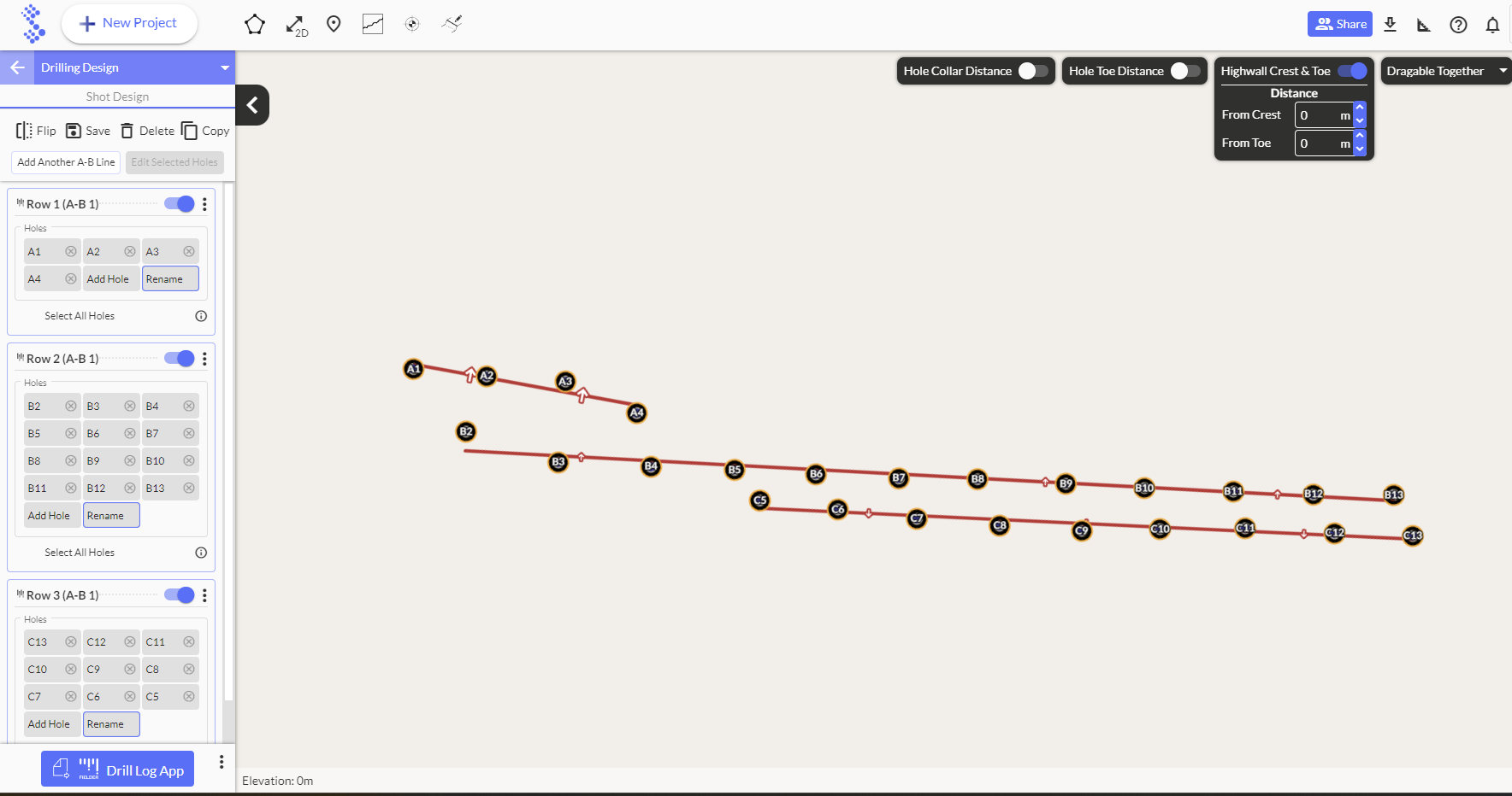 Next, the user will need to input the following fields in the upper right hand corner (Hole inclination, Back Break, Diameter, Subdrill, Bench Height). Although in the truck data, inputting these values will allow Strayos to report them correctly. Once complete, the user will see their data populate in the virtual model.