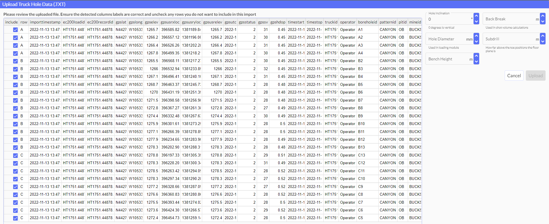 Next, the user will need to input the following fields in the upper right-hand corner (Hole inclination, Back Break, Diameter, Subdrill, Bench Height). Although in the truck data, inputting these values will allow Strayos to report them correctly. Once complete, the user will see their data populate in the virtual model.
