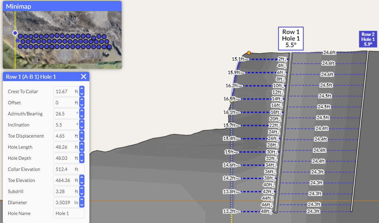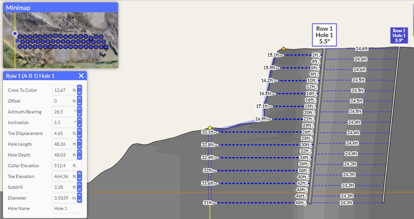 Lets take a look at the profile view of a blast design, and how adjusting the toe can directly affect the quantity of the shot. In the picture below, the shot holds a Total Volume of 25,814.24yd³, Total Area of 1842.8yd².