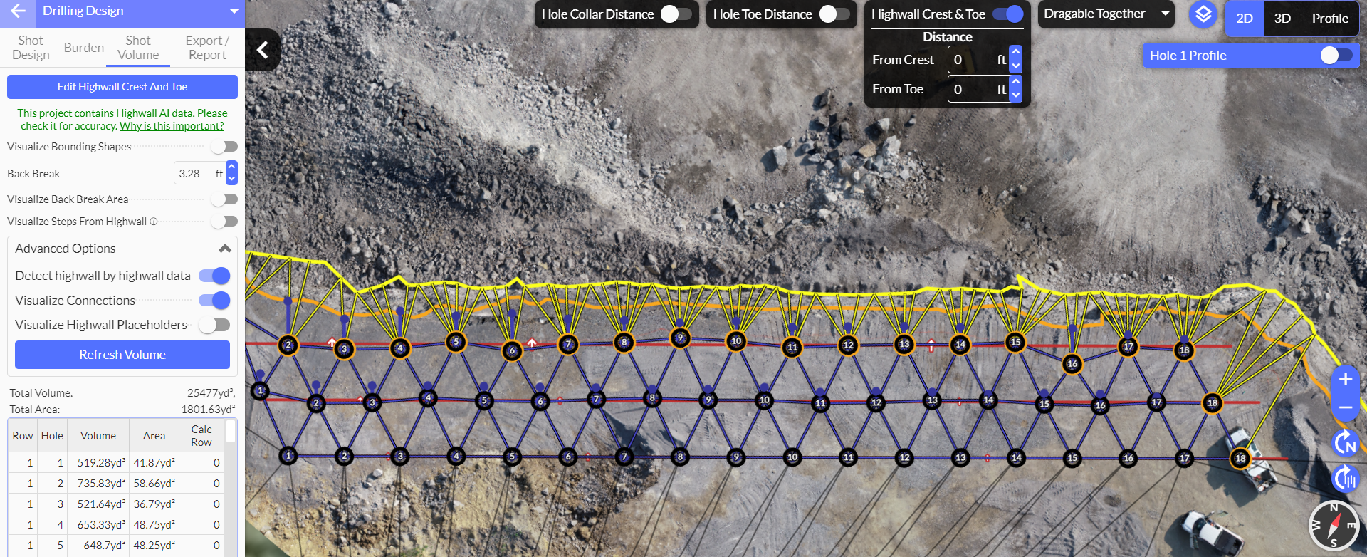 You also have advanced options when quantifying your shot. Here, you can detect the highwall by AI highwall data, visualize and adjust connections along the crest and toe lines, and visualize the highwall placeholders. All these tools ensure you can measure the most accurate quantities on your site.