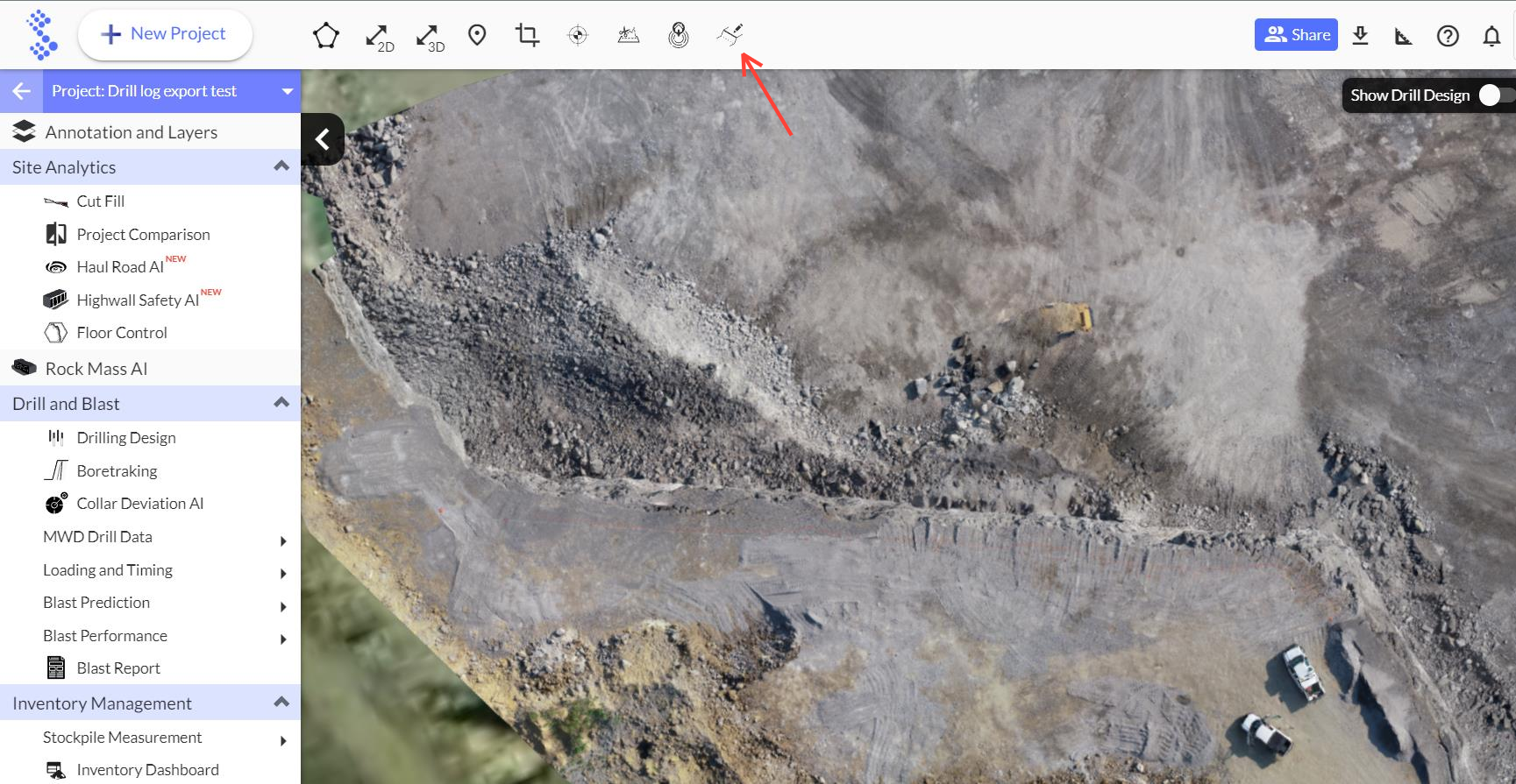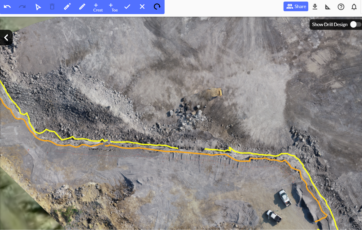 When uploading a project, Strayos will automatically detect the Crest and Toe of your site using its AI. The crest and toe can easily be edited to make sure the locations are accurately placed. The importance of this detection is what allows the software to detect parameters where to quantify an area on your site. How far the boundaries of your shot volume stretch is based on the Highwall AI data. If that data is missing or inaccurate your volume could be detected wrong. Check the toggle on the top of the map to view the crest and toe contours. If they are inaccurate use the 'Edit Highwall Crest And Toe' button above to edit them. First, click on the Edit Crest and Toe: