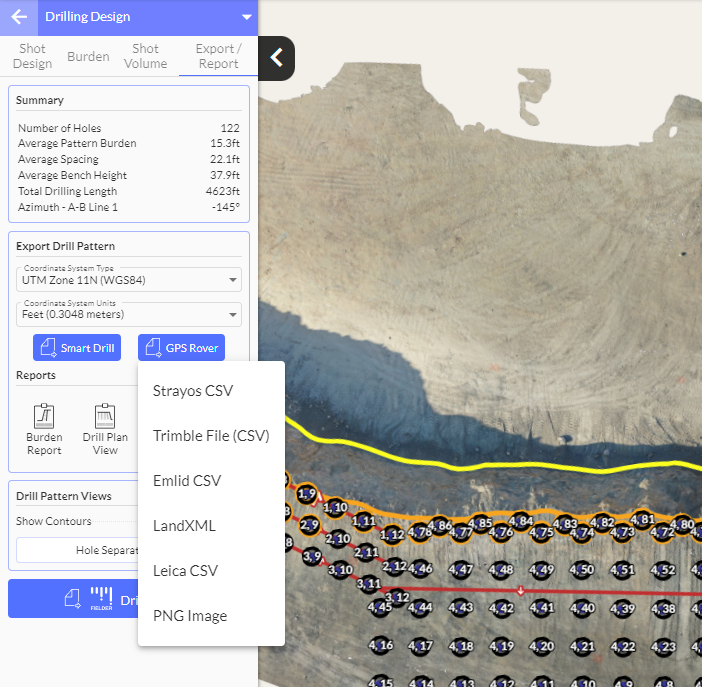 Once the drill design is complete, there are several CSV export options suitable for a variety of GPS equipment and Smartdrill Formats: