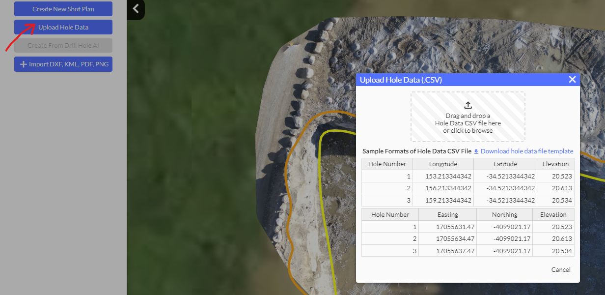 Within the Strayos platform, CSV files can be imported for shot layout and design purposes. To begin, when creating a drill design, users can select the Upload Hole Data option to click and drag a CSV file into: