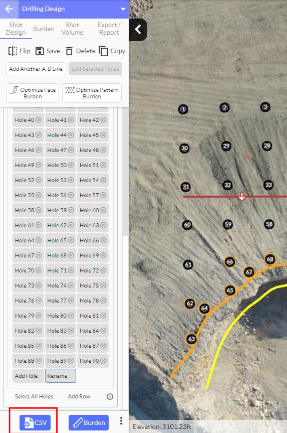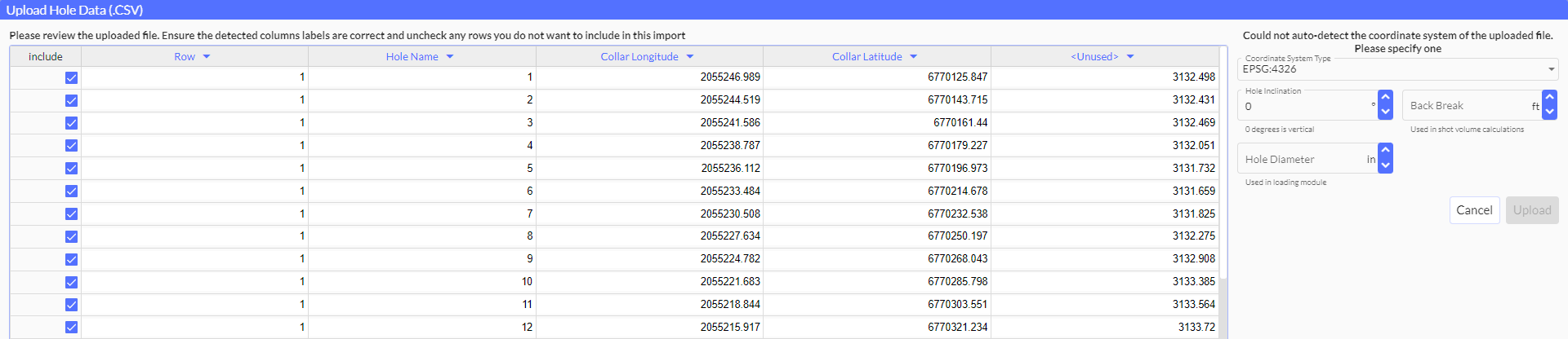 Within the Strayos platform, CSV files can be imported for shot layout and design purposes. To begin, when creating a drill design, users can select the Upload Hole Data option to click and drag a CSV file into: The format of the CSV can be seen ...