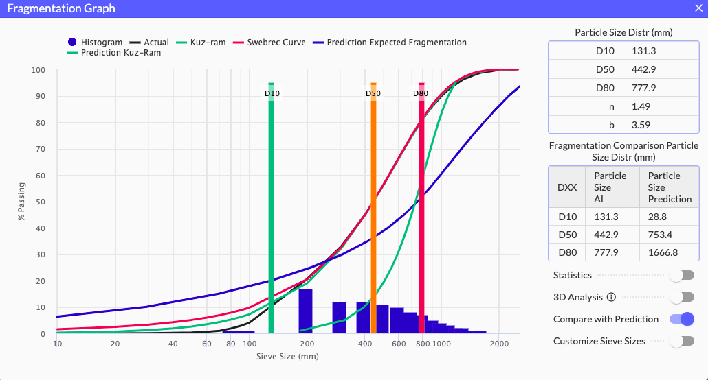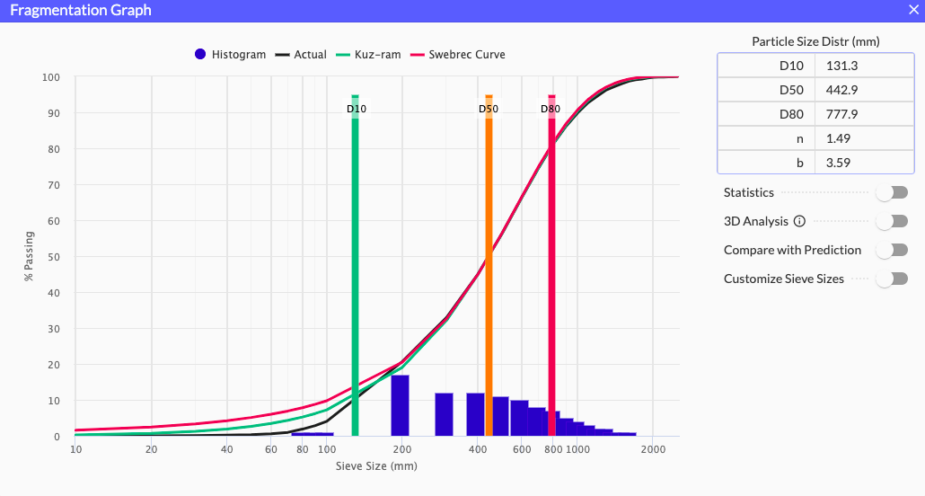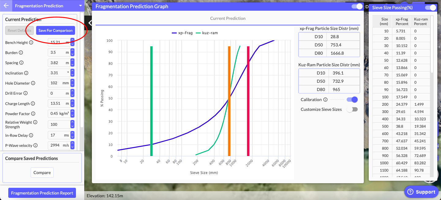 Each line represents a different industry standard prediction model (Kuz-ram and xp-frag). You can decide to use either model as the basis for your analysis. Both models will be calibrated using AI to match the fragmentation measurements made for that site.