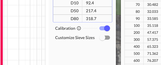 The sieve sizes in the table can be customized using the "Customize Sieve Sizes" toggle. This lets you make predictions based on sizes that are most meaningful for your operations e.g. maximum crusher jaw size or shovel bucket size.