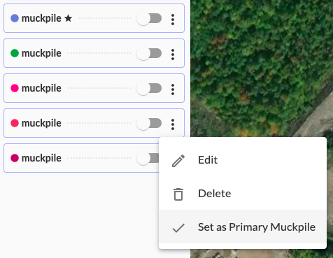 Any muckpiles that have been detected by the AI will be listed in the sidebar. The muckpile with the star next to the name is the Primary Muckpile. This is the one which is used to calibrate future predictions.
