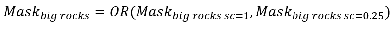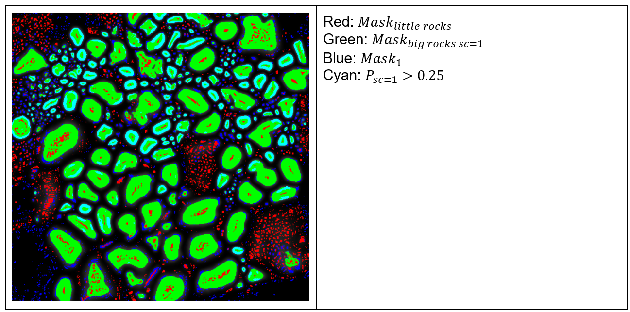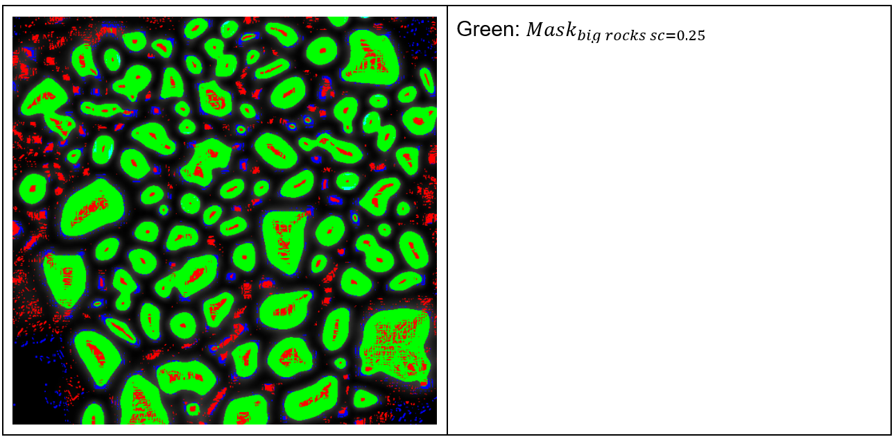 In the image above can be seen how the results of rocks’ predictions with scale=1.0(left image) detect little rocks and “does not see” big rocks, when results of prediction with scale=0.25 (right image) detects big rocks and “do not see” little rocks.
