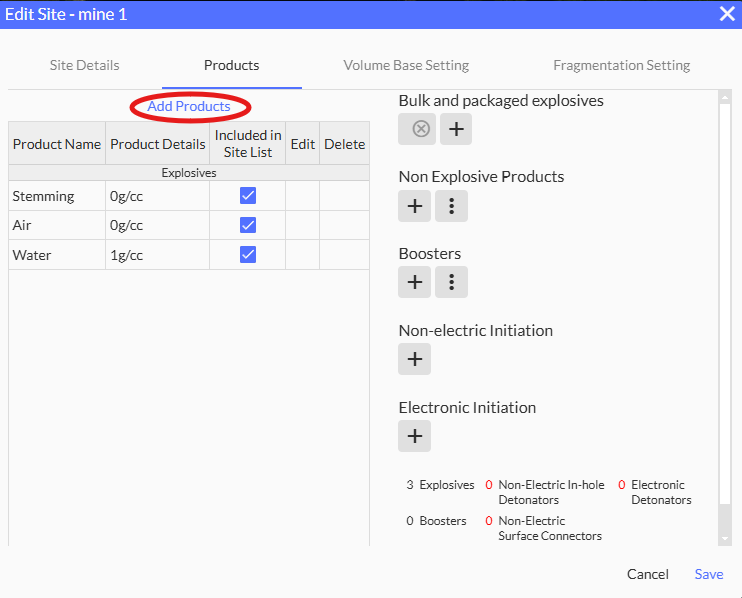 When looking to account for Non-Explosive Products within the blast design and reporting process, Strayos has an option to add such products to user site product details. Adding products from Site Details: Under the options of the site, select "Edit" ...
