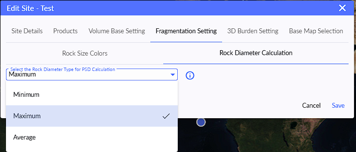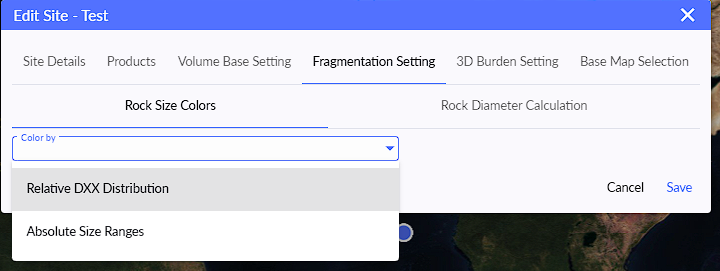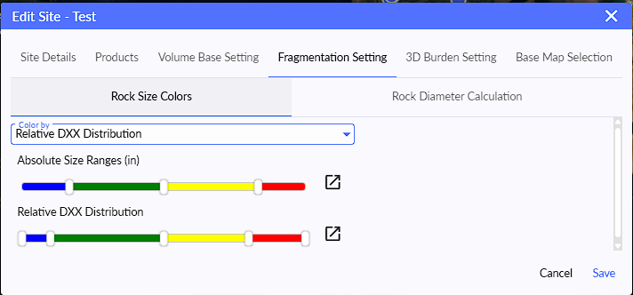 Strayos offers several ways to customize Rock Colors and Rock Diameter Calculations in the fragmentation module. Users can choose between these settings in their site settings, pictured below. Once the settings are enabled, it will be used for new projects.