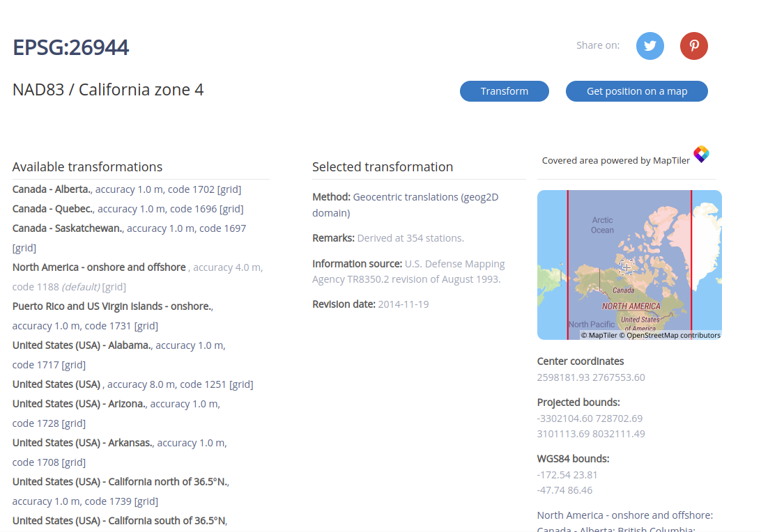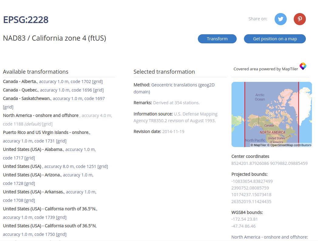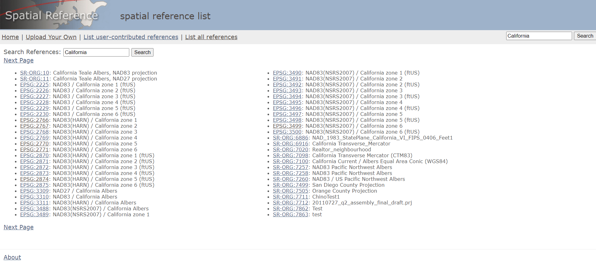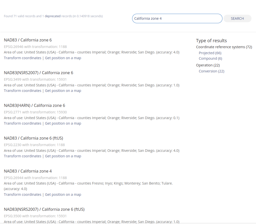 With the search of California, we can see all possible EPSG codes in the state. With the understanding of what zone and datum you are in, you can then match the corresponding EPSG code to that. In cases where there may be two codes listed, click on each as it may say to use one vs another due to and update or error.