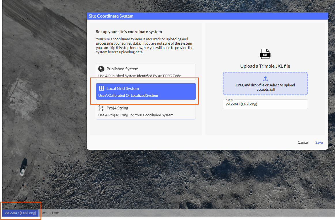 If a site has already been created, and users are looking to upload their .JXL files, click on the coordinate system status bar in the lower left-hand corner and select Local Grid System. Here, users can upload their files accordingly.