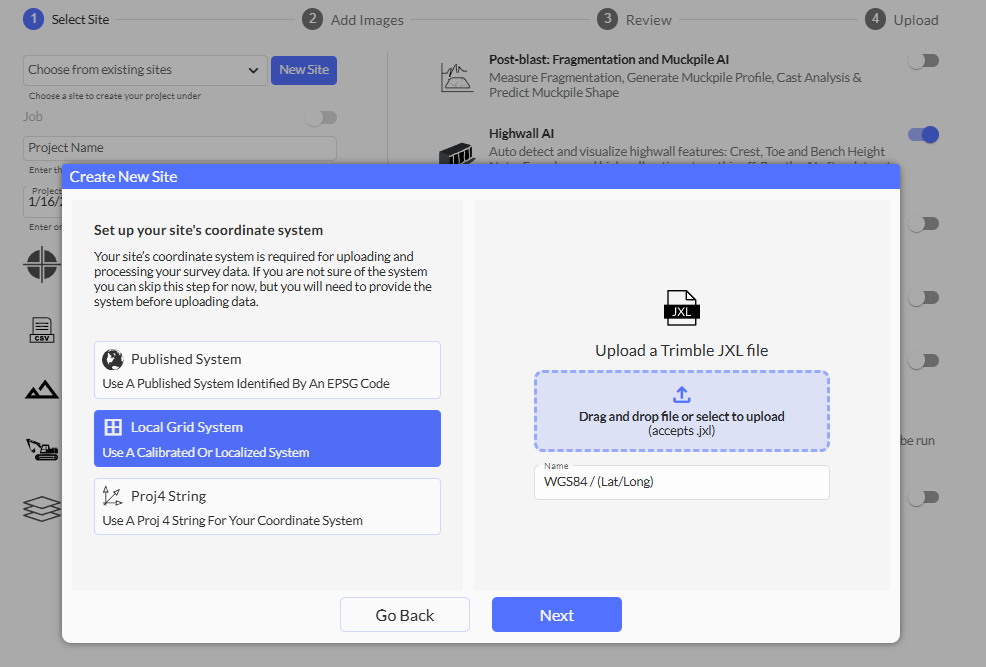 In Strayos, users can upload their .JXL files to support their local coordinate systems. This can be done when creating a site for the first time, or once a site is created, the CRS can be changed. When creating a new site, select Local Grid System. Users can then upload their files directly into the blue box.