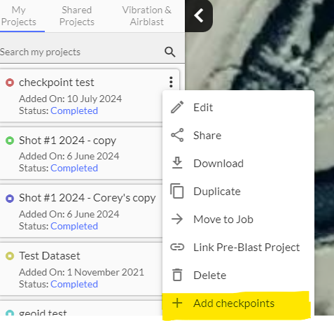 To upload checkpoints within Strayos, click on the options next to the project which you are looking to upload the points to: