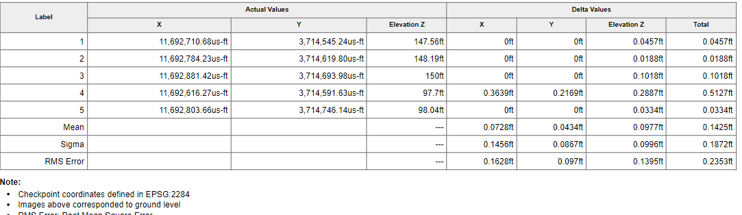 The report will display the actual values measured by your GPS, uploaded from the CSV file, in comparison to the position on the processed model. The Mean, Sigma and Root mean Square Errors will appear below.