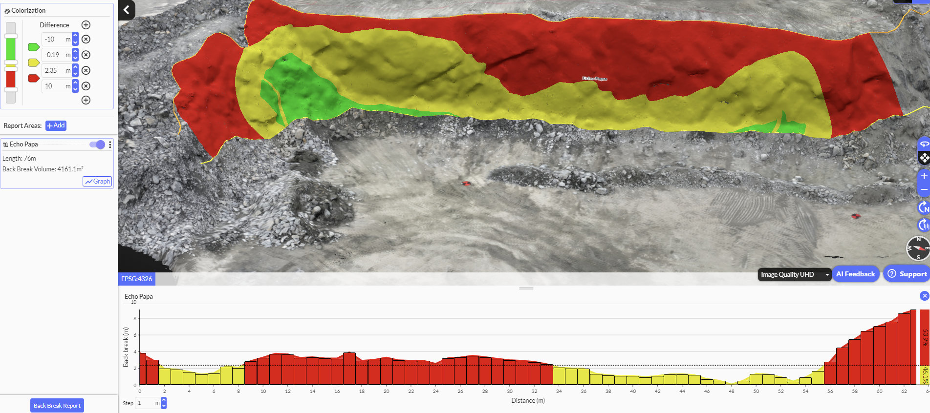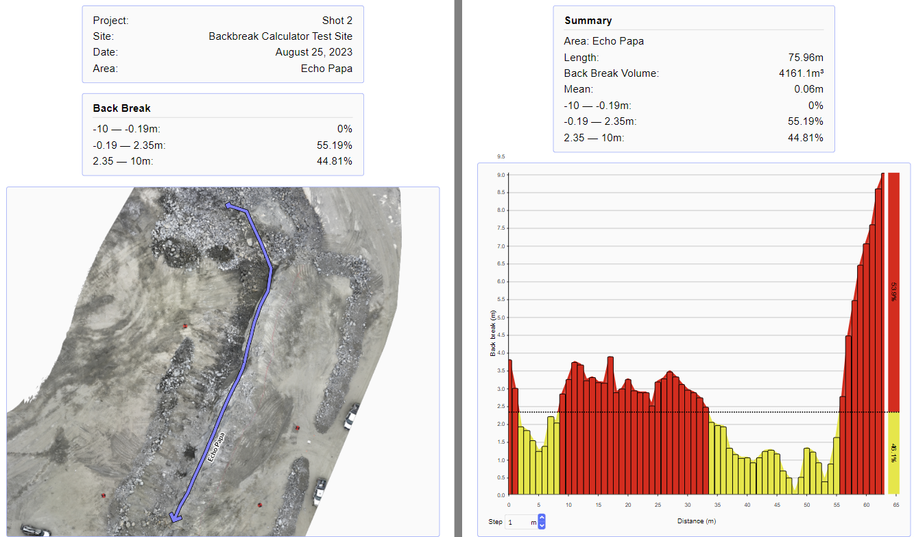 Then, by clicking and tracing along the face (click-to-end annotation) users will define the length of the face where back break will be measured for volume. In this case, "Echo Papa" was drawn, where a volume is shown on the left hand toolbar, and a graph showing back break distance is shown below.