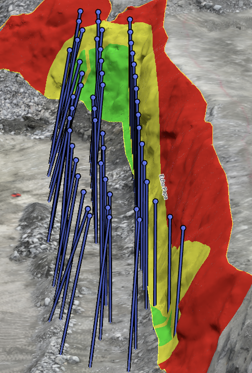 When selected, Strayos will show the 3D model with a heat map on the face. This is where users can adjust thresholds to the values and colors they wish, as well as annotate sections of the highwall to measure back break.