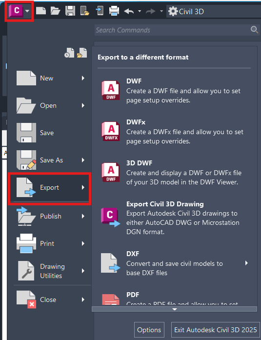 Users can export their files from C3D using the drop-down in the upper-right-hand corner, pictured below: