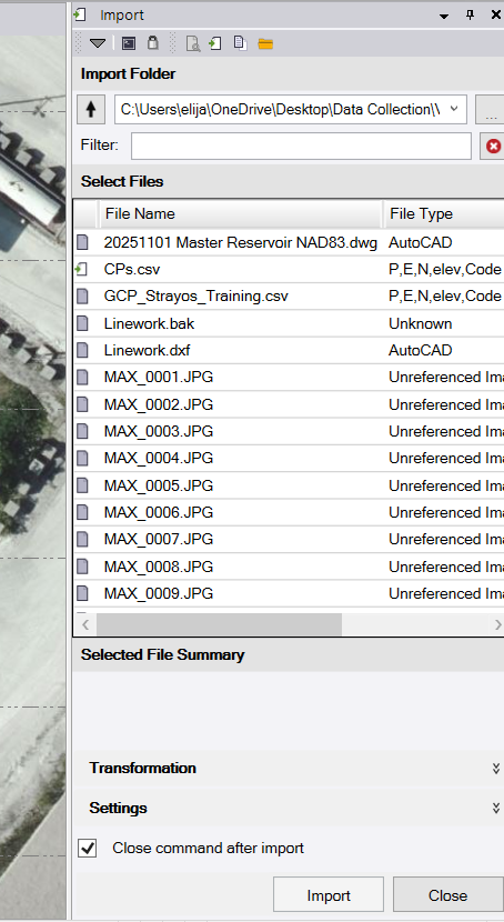 Select the files that are to be imported, and select import. For CSV files, ensure the order of Point, Northing, Easting, and Elevation is correct, as well as your project CRS in TBC.