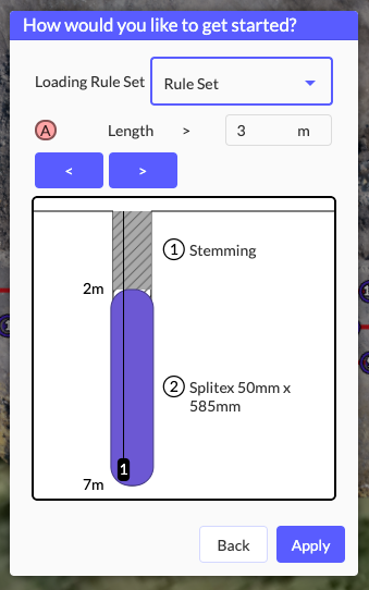 This report gives a summary of the loading rule sets used in the current shot. It can be used in the field to help make loading change decisions if conditions change. For example if a hole has collapsed and is now far shorter than designed, the blaster can refer to the loading rules sheet to see how that hole should be loaded.