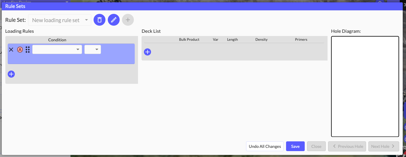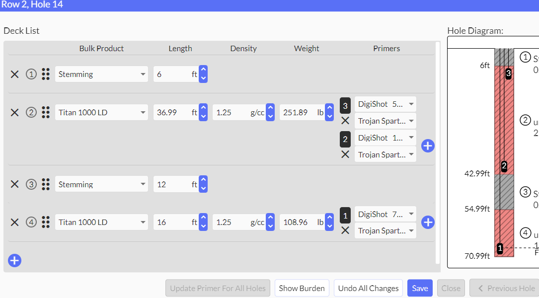 You can edit loading for an individual hole in a similar way to creating loading rules. Add a deck for each segment of the hole and then specify the product properties and add primers.