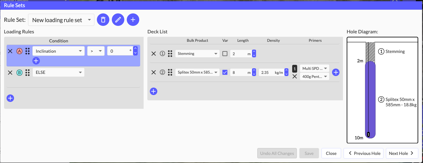 For example, below you can see how to create the rule for loading all angled holes (inclination > 0) with 2m of stemming and then packaged product (Loading Rule A). All other holes will be loaded according to Loading Rule B as it has the 'ELSE' condition.
