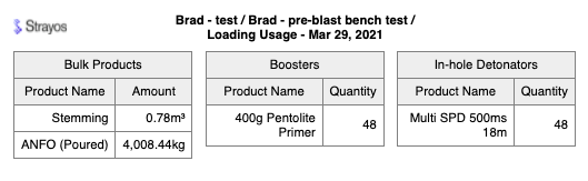 This report shows a table with the amount of product that is designed for each hole. This would be used by the truck operator and blaster in the field to plan and record how much product is being loaded into each hole.