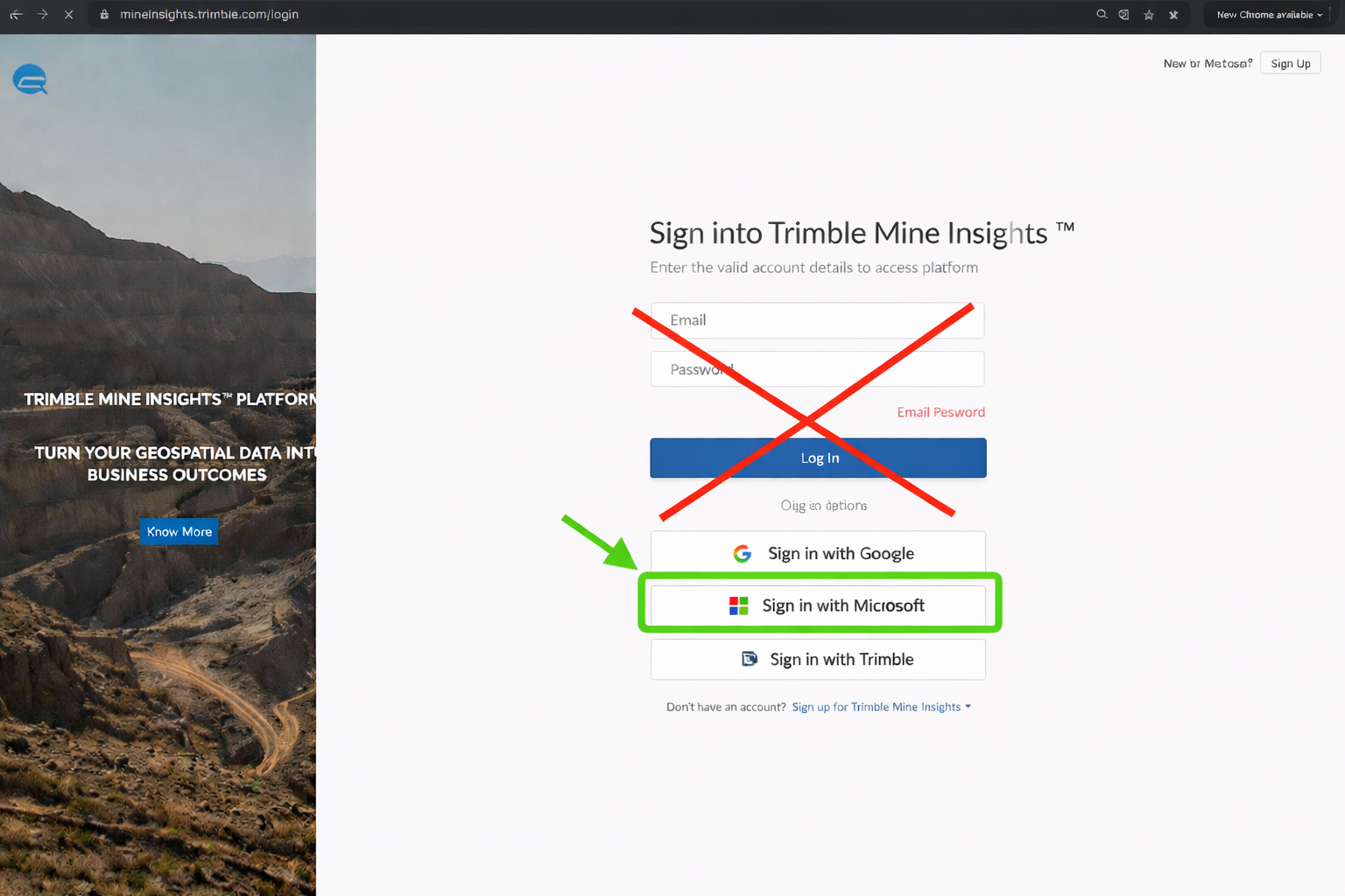 - When a user clicks Sign in with Microsoft, Trimble Mine Insights redirects the user to Microsoft's secure identity platform.