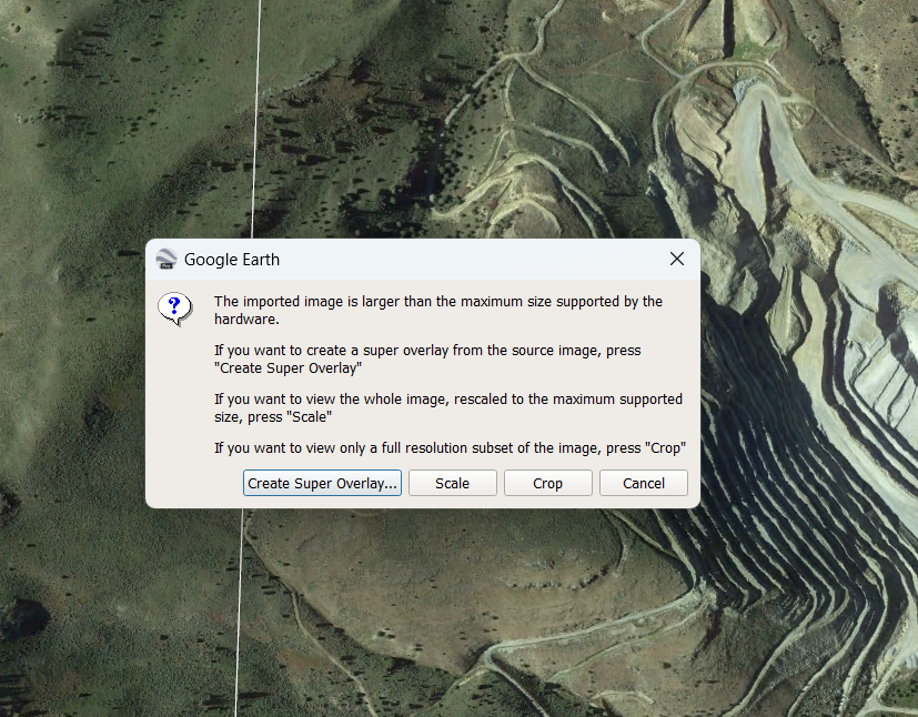 Google Earth will then navigate to the location and ask how you would like to overlay the image. To view a complete image of the Orthophoto in correct scale, select the Create Super Overlay option.