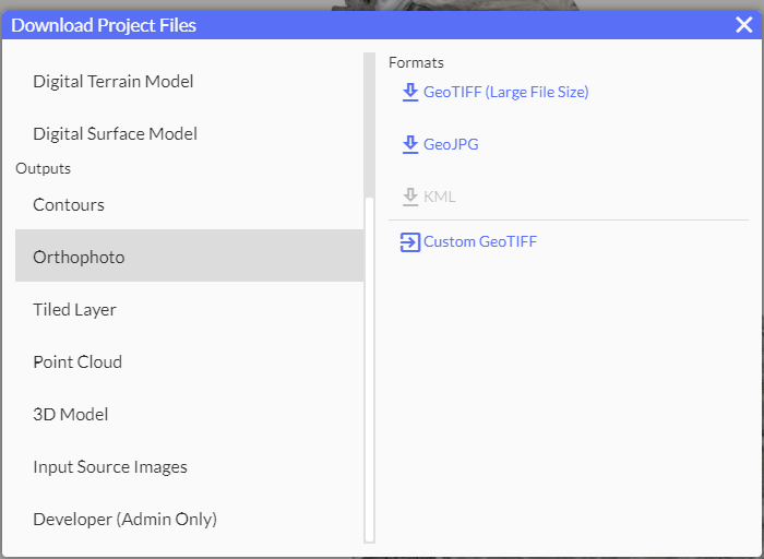 First, navigate to the download menu on the top right toolbar and choose the GeoTiff as a download option.