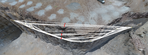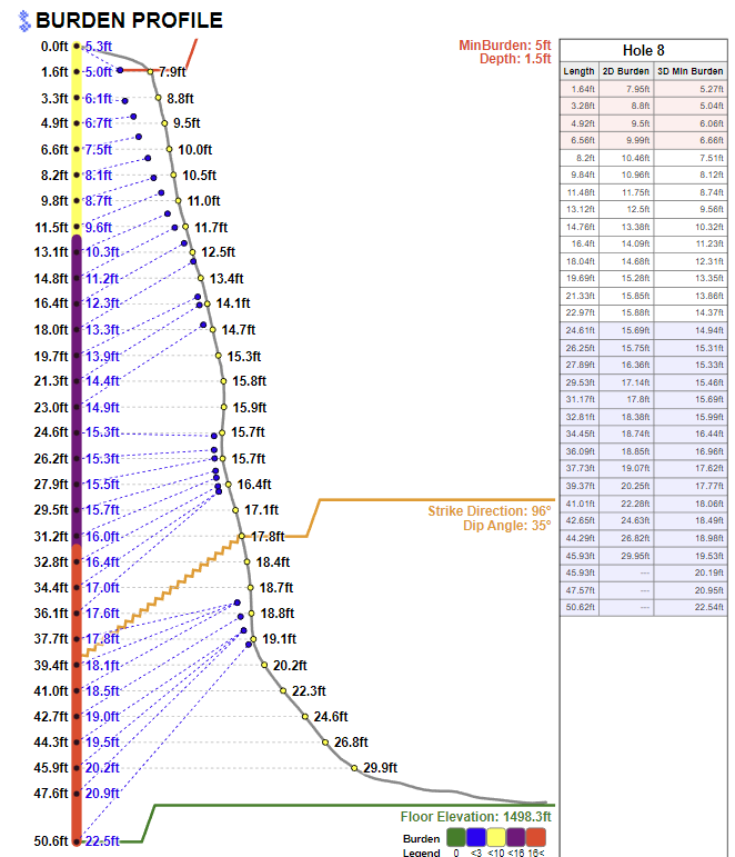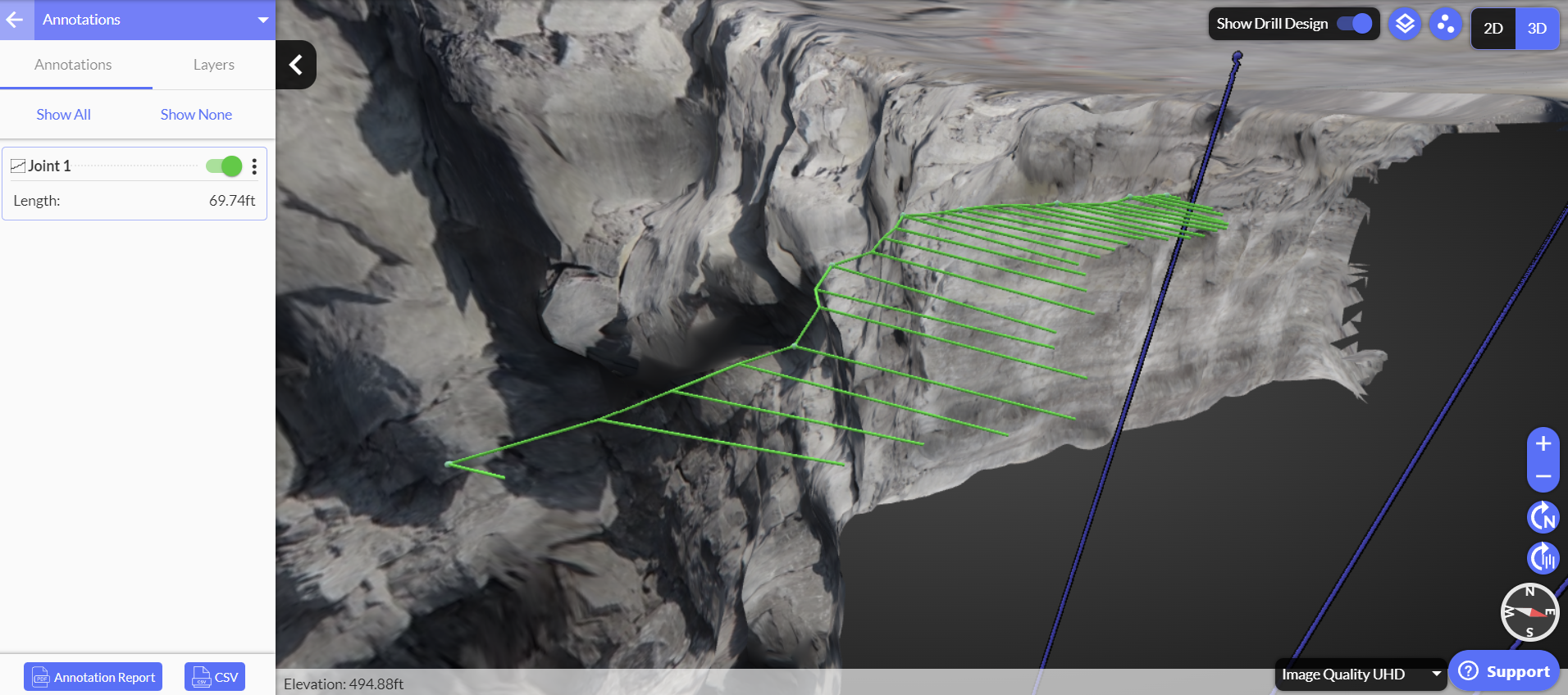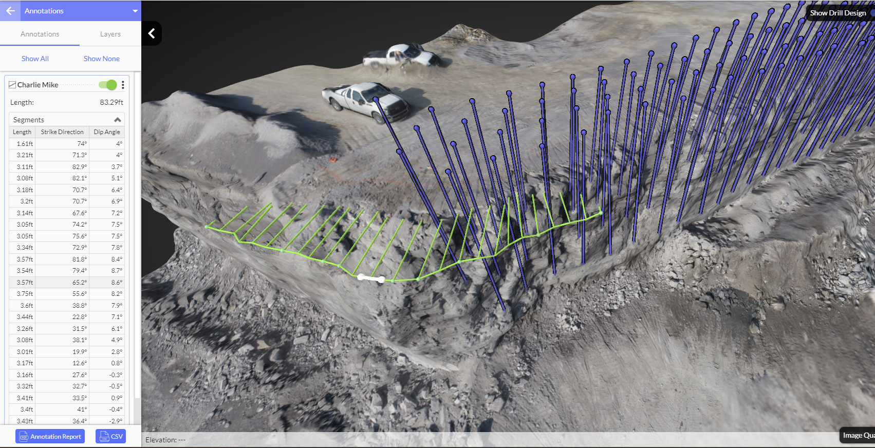 When selected, you will be brought into the 3D view, where you will manually draw an annotation line along the rock joint or seam. This will then appear as an annotation that can be moved or edited easily. Visually, the 3D lines intruding the face are all a constant length, however they follow the surface of the highwall. See, how the vectors are interpolated below the Burden Profile.