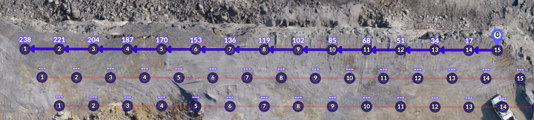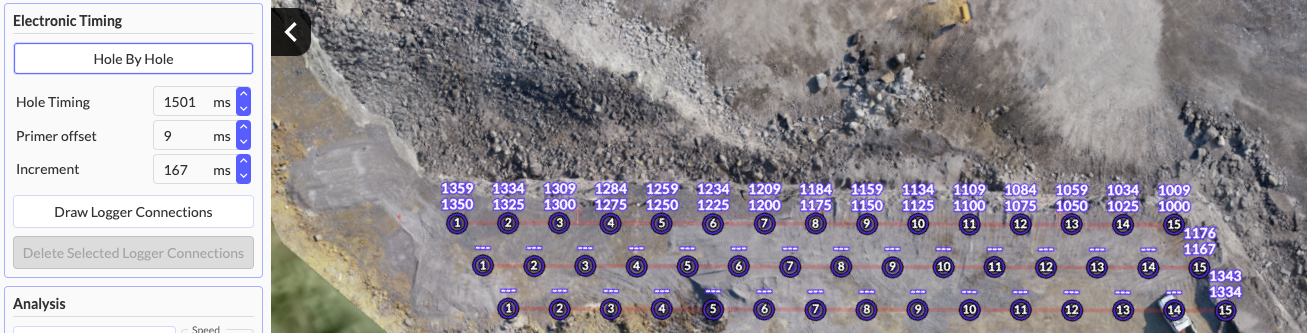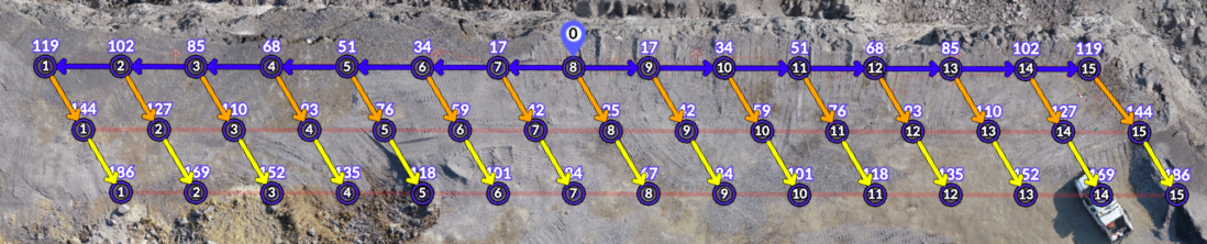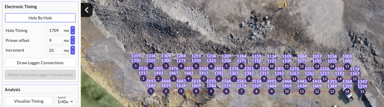 You'll notice the nominal surface delay timing number is shown above each hole as it is connected. This represents the number of milliseconds after the initiation point that each hole will be initiated