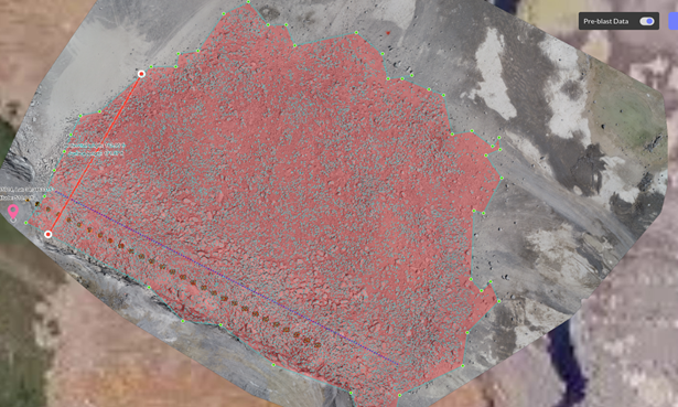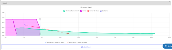 Cast line is obtained from the front row of pre-blast shotplan or boretrak, translating with average 3D burdens distance towards blast direction. In the below image, it displays as the blue dotted line.