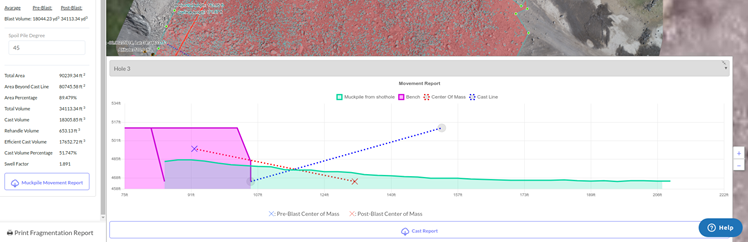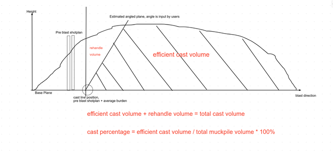 To calculate cast volume, we require an input from users to indicate the estimated spoil pile degree. we are generating a cut line (blue dotted line in the graph) based on the input value and calculate cast volume (volume below the cut line). Cast volume is not dependent on holes. It would only depend on spoil pile degree input value and muckpile geometries.