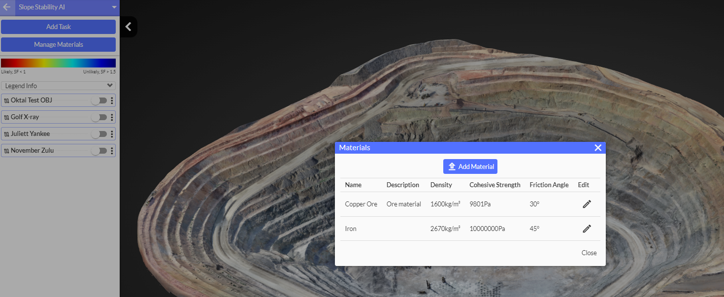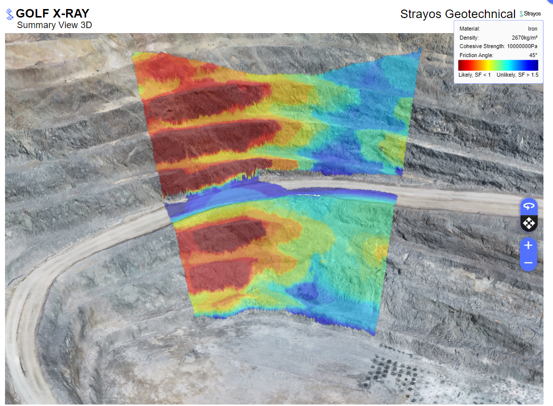 Strayos' Slope Stability AI is a tool that allows users to automatically obtain a Safety Factor rating for their site's slope analysis. Strayos utilizes the 3D model in combination with Rock Mass data, and specific material properties to calculate the safety factor. Methods of 3D limit equilibrium are included in the fundamental analysis methods of Strayos' Slope Stability, which are commonly used in engineering practice. The Modified Bishops method is used to analyze circular slip surfaces. In this method, the safety factor is defined as the potential sliding along a failure surface.