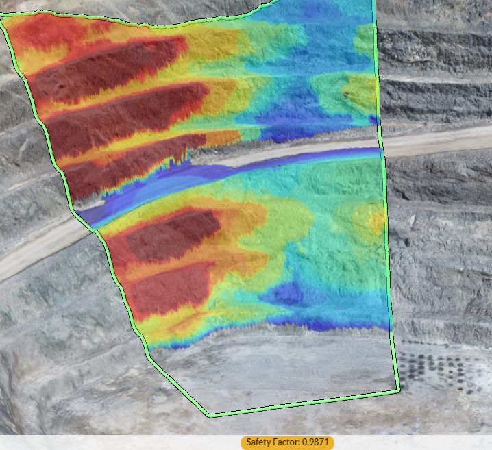 Once the area has been processed, a colored heat map will be shown to represent the Safety Factor with the area of interest. The safety factor value shown at the bottom of the screen shows the value at the point of the cursor as it moves across the heat map.