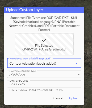 When your file is chosen, the menu will appear on how yo would like the DXF to be interpreted. In this context, we will choose the contour option. The EPSG code will auto populate based on the DXF file and model coordinates.