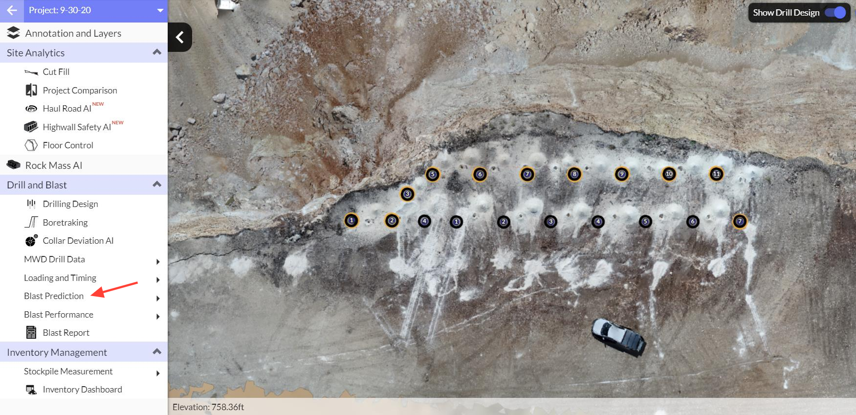 To view the prediction rings, toggle on the Prediction Rings seen in the top right-hand corner of the screen. The threshold can be toggled by the user to show the range and value of PPV readings, where Red can be used to exceed PPV limit, and green to show tolerable.
