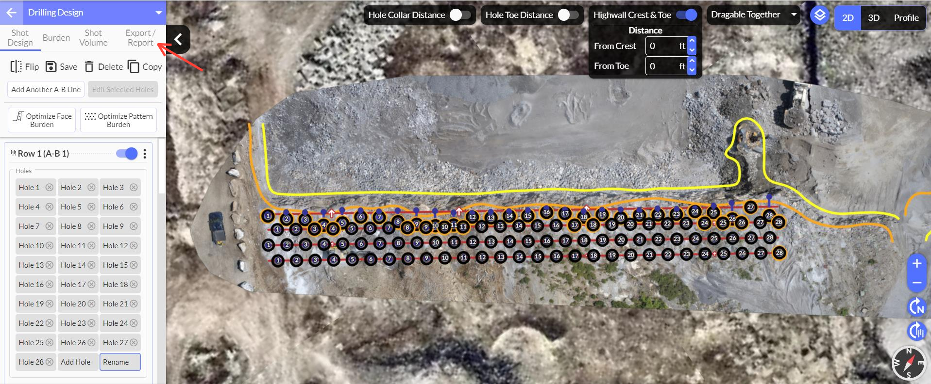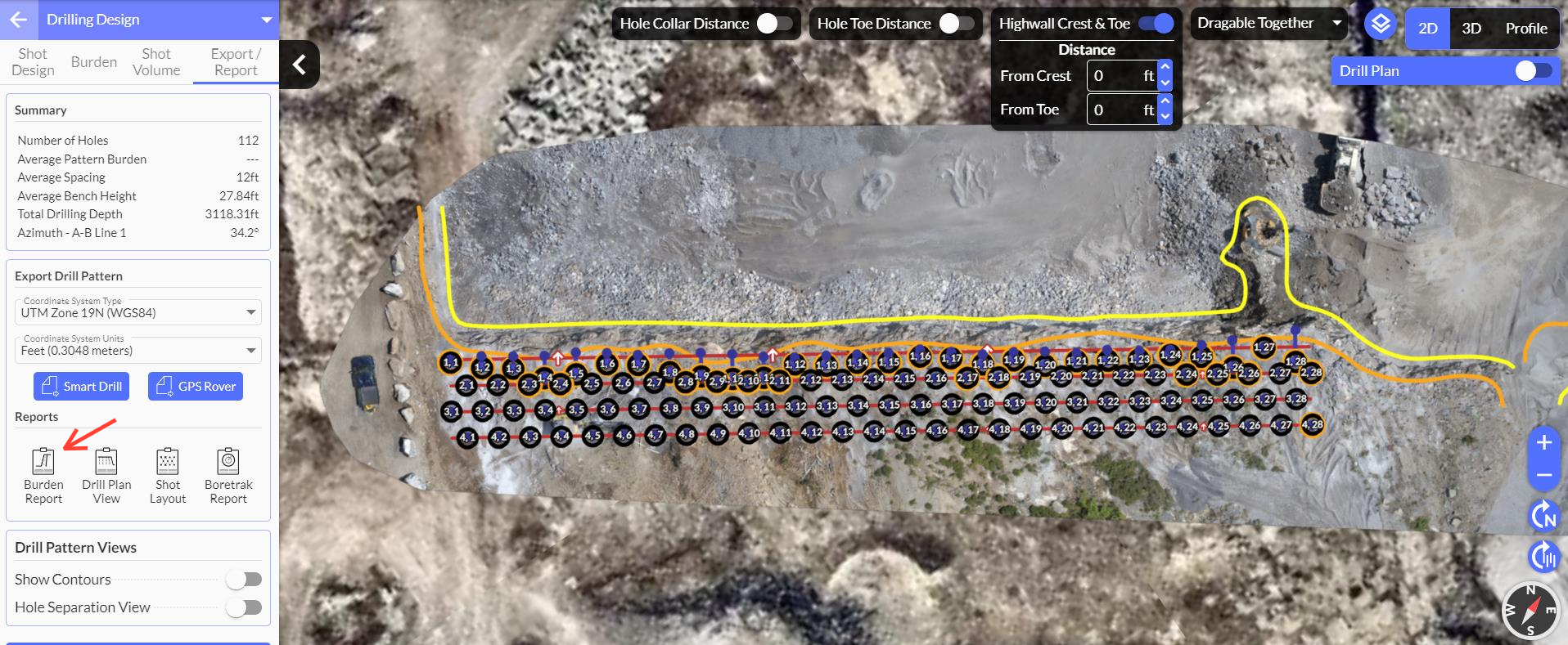 Once creating your drill plan, to view the Inter-row burden report you will navigate to the Export/Report tab to download the Burden Report