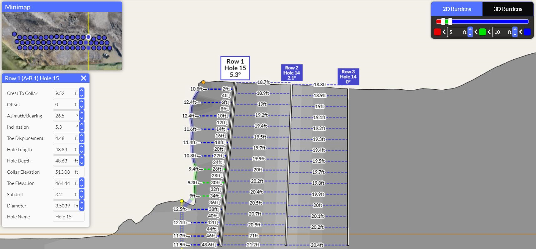 For Inter-Row burdens, navigate to the Profile view to view burdens between your proceeding rows. Adjustments can be made to each hole as needed. The selected hole will appear in the minimap in the top left hand corner of your window.
