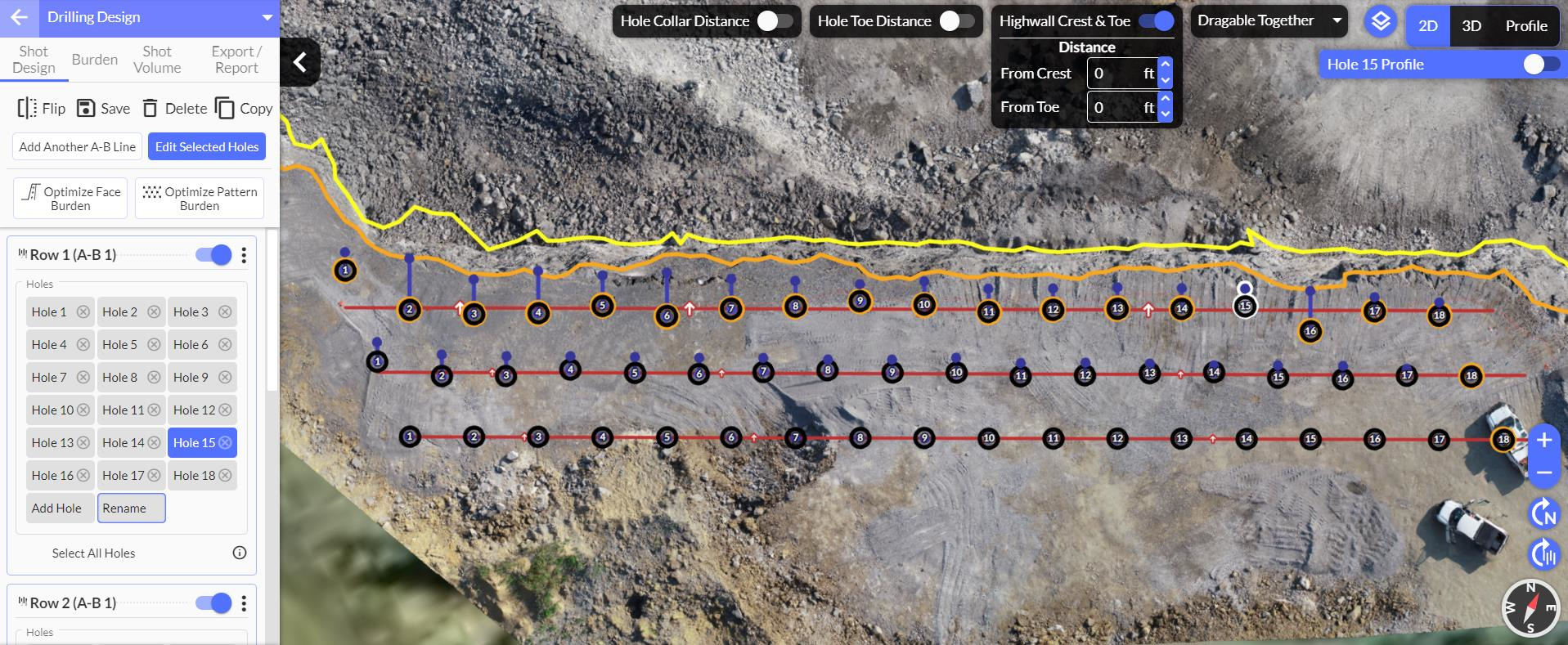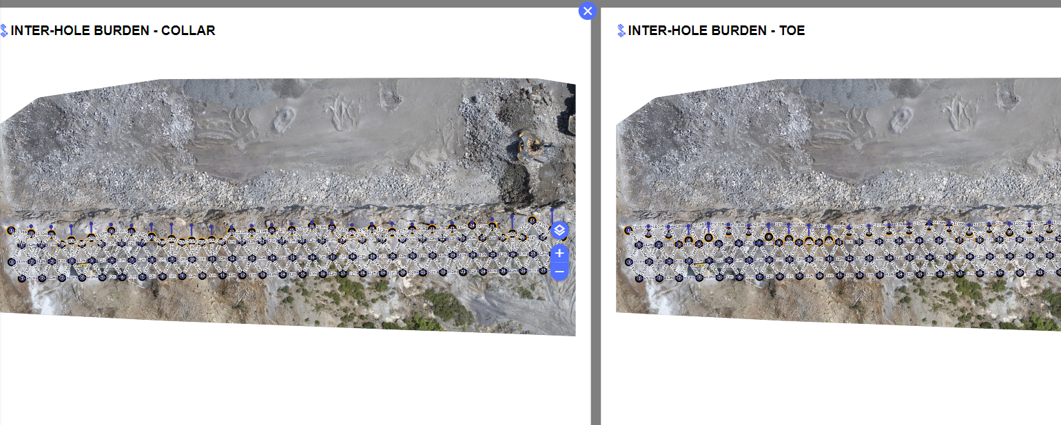 Once Downloaded, you can view the Inter-hole burden at the crest and toe locations. Here you can also toggle on and off what information is displayed on each hole in the drill plan (depth, azimuth, inclination, planned holes).
