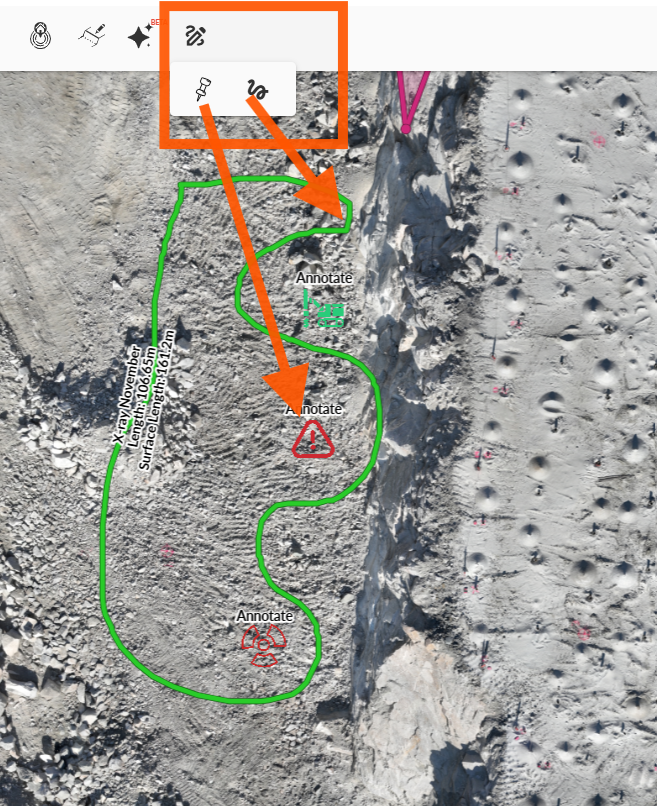 Select the markup icon from the toolbar to open the markup options. From there, the user can choose between creating area boundaries or placing symbols.